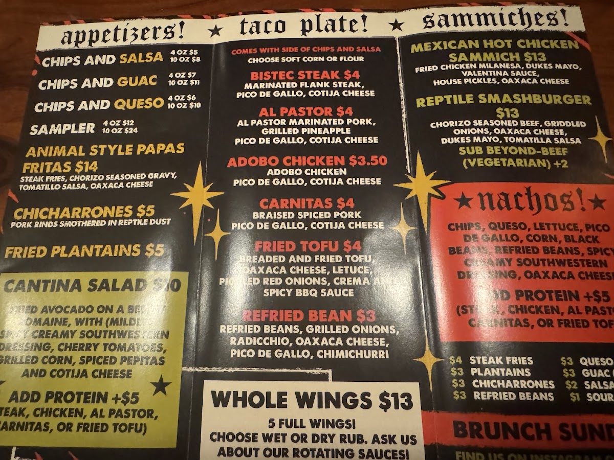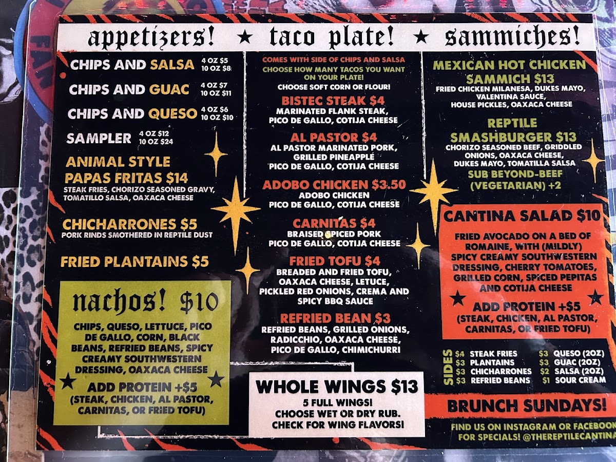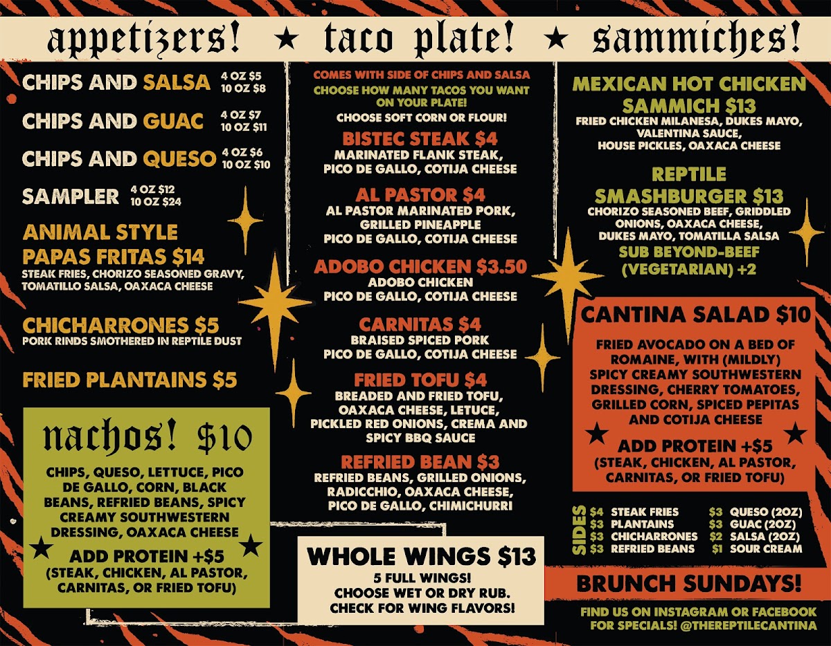 When you step into The Reptile Cantina, you're not just in for a meal - you're in for an experience. Located at 108 E Meeting St unit b in Morganton, NC, this spot offers a menu that's as vibrant and bold as its name suggests. Whether you're here for a casual bite or a full-on fiesta, the Reptile Cantina Menu delivers with a mix of flavors that cater to all tastes. Expect fresh, locally sourced ingredients and dishes that range from mouthwatering tacos to sizzling fajitas, and don’t forget to try their signature sauces and drinks, which perfectly complement every bite. It’s a laid-back, fun place where you can enjoy great food and even better company. Every dish has its own twist, making each visit unique.